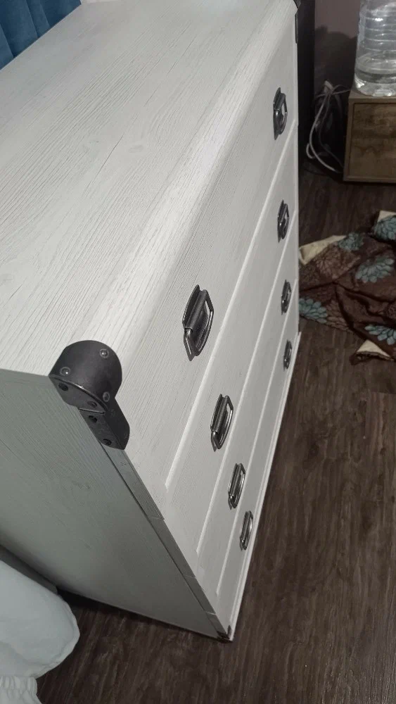 Дизайн тумбочки подчеркивает винтажный стиль. С внешней стороны фасады искусственно состарены, благодаря чему виден рисунок сосны. Латунные ручки дополняют образ, а накладки на уголках предотвращают лишние потертости.