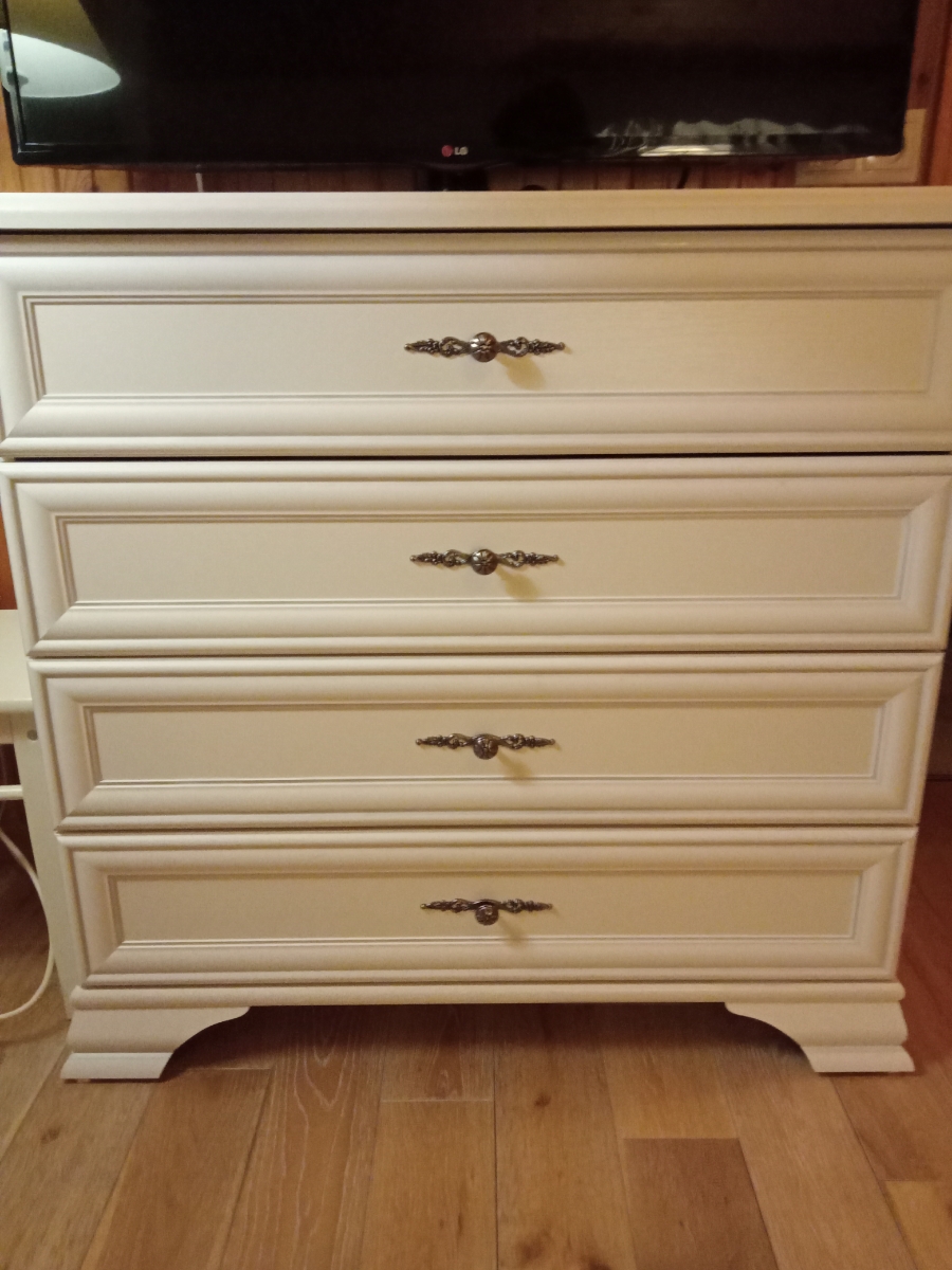 Комод имеет четыре просторных выдвижных ящика с металлической ручкой. Внутри вы сможете удобно разместить одежду, постельное белье и другие вещи.
