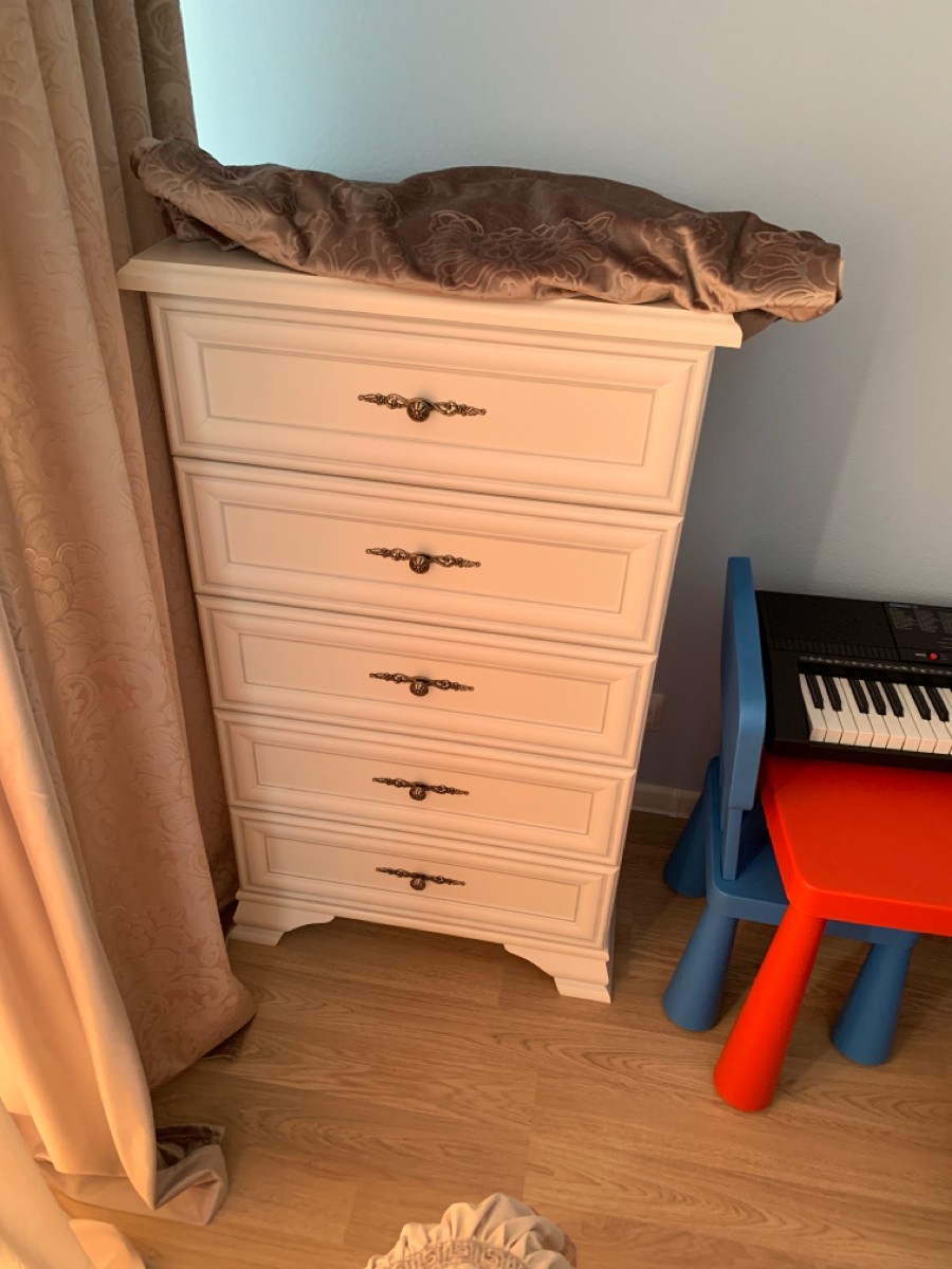 Комод состоит из пяти выдвижных ящиков для хранения большого перечня вещей: от одежды до школьной канцелярии. Верхняя столешница станет удобным пространством, где можно разместить декоративные предметы. Она также служит удобной поверхностью для хранения часто используемых вещей, которые всегда должны быть под рукой.