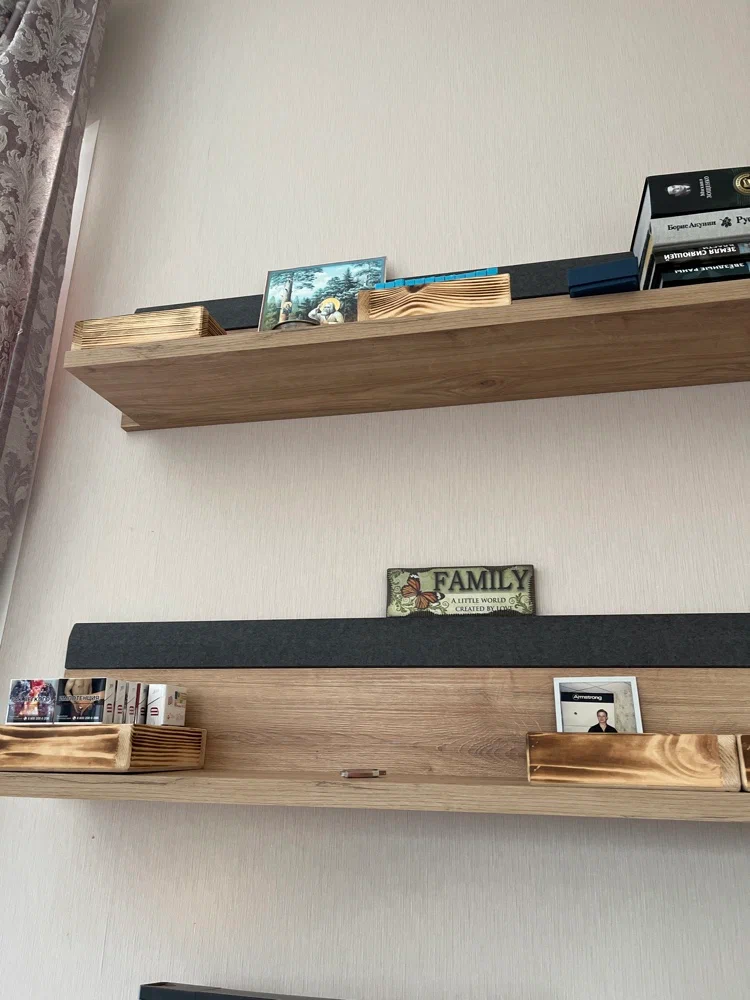 Полка выполнена из ламинированной ДСП и проста в уходе. Достаточно протереть поверхность от пыли мягкой тканью. Сочетание цветов графит и светлого дуба делают эту мебельную единицу универсальным решением для многих интерьерных решений.