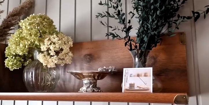 Модель навешивается на стену с помощью дюбелей, что гарантирует простоту установки и надежное крепление. Латунные накладки на уголках придают полке стильный вид и защищают от внешних воздействий.
