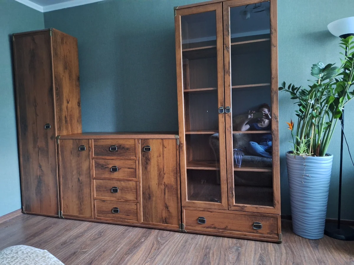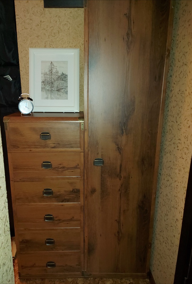 Шкаф имеет пять глубоких ниш, состоящих из четырех съемных полок. Благодаря универсальной дверце, которая может навешиваться как слева, так и справа, вы сможете удобно расположить шифоньер в комнате. Латунные накладки, стильная ручка и отделка из МДФ делает эту мебельную единицу центром внимания в любом уголке помещения.