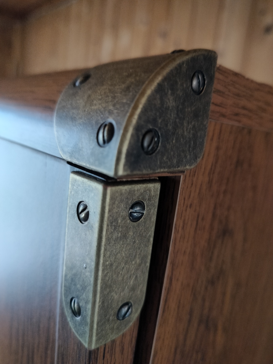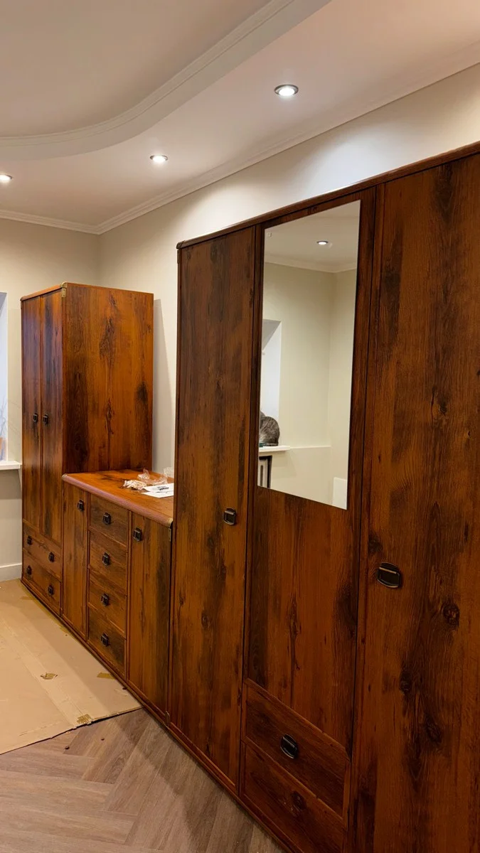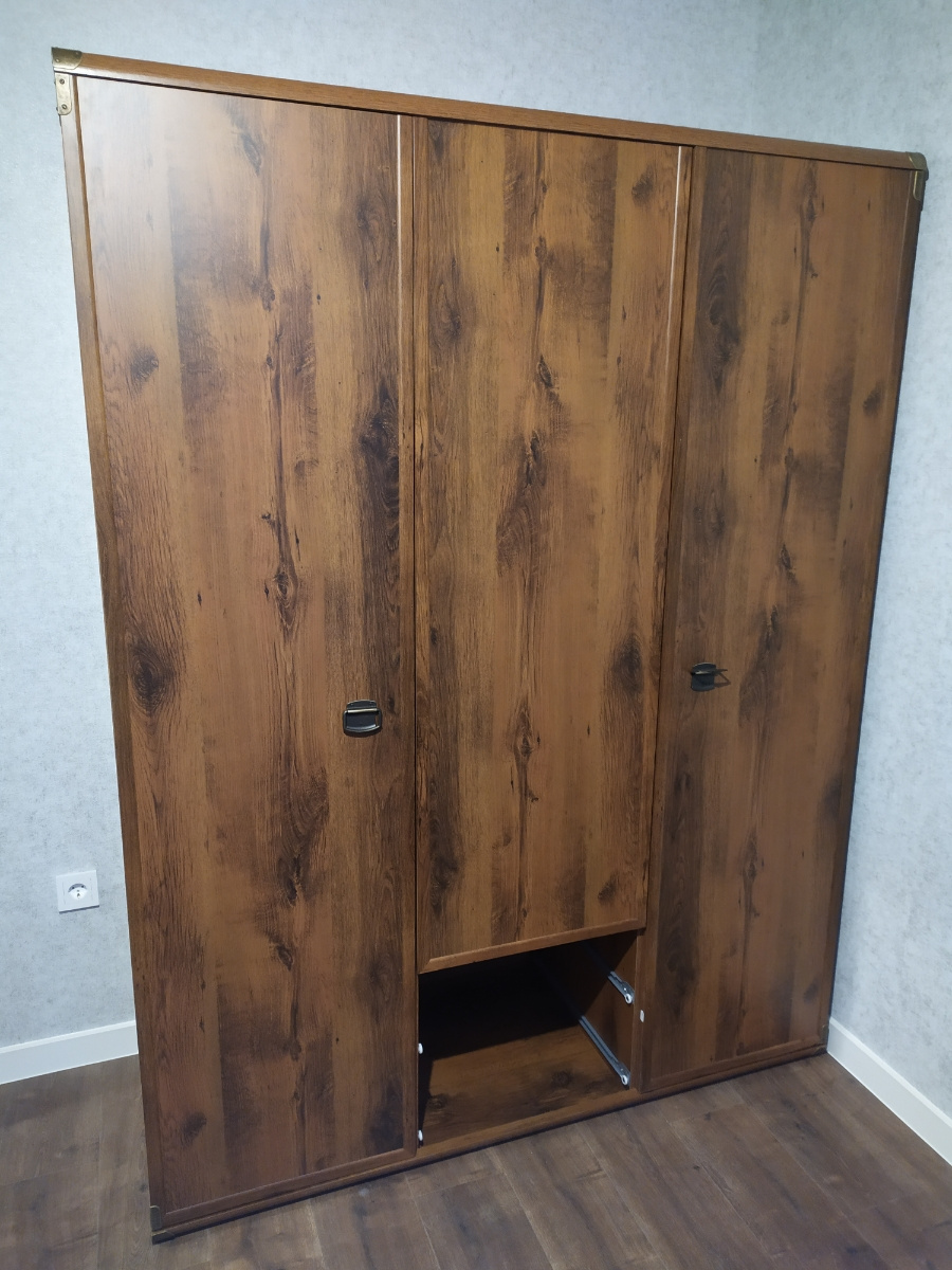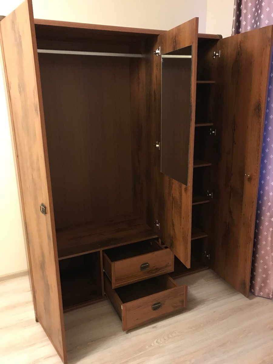 Внутренняя дверца шкафа оснащена зеркалом, что добавляет удобство при использовании. Латунные накладки, стильные ручки и отделка из МДФ делает этот шифоньер центром внимания в любом уголке комнаты.