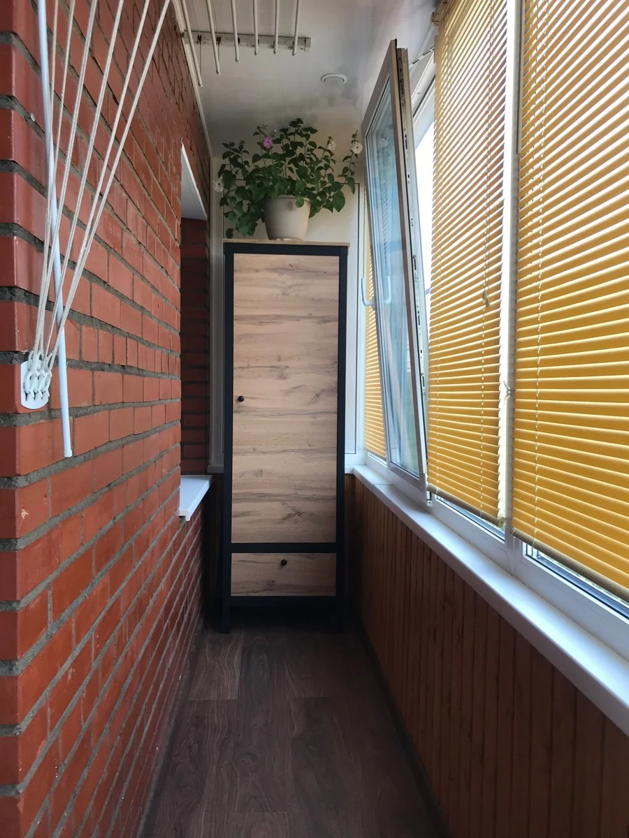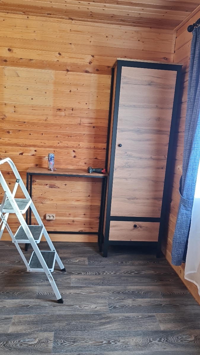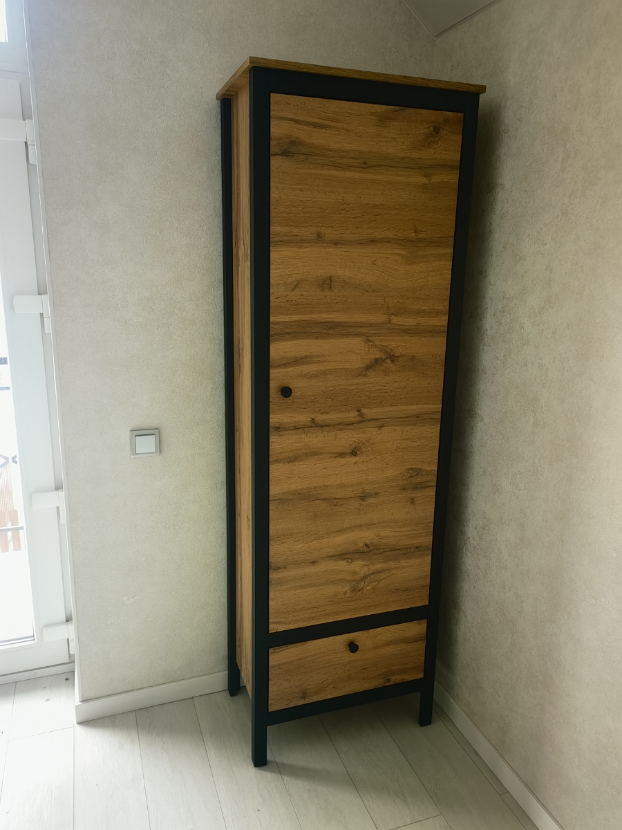 Шифоньер изготовлен из ЛДСП с ярким древесным рисунком. Черные планки и ножки — из МДФ. Дверца может навешиваться как в левой, так и с правой стороны, что значительно облегает расположение модели в комнате.
