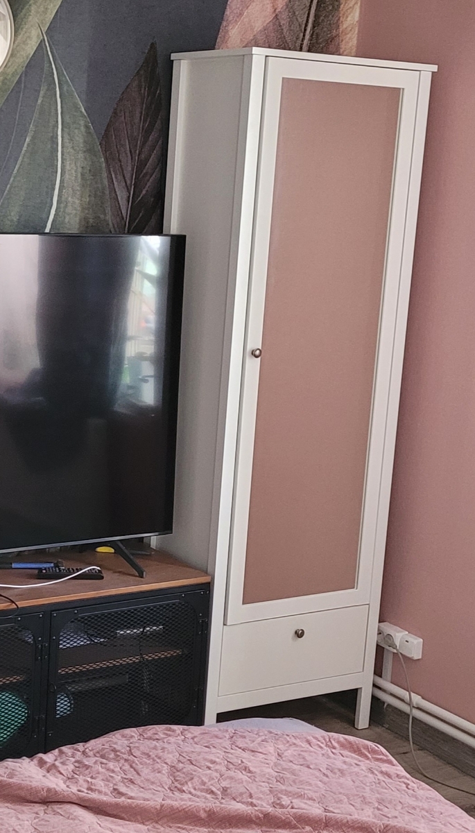Внутри шкаф имеет прочную штангу, которая позволяет развесить одежду на вешалках. Верхняя полка предоставляет дополнительное место для хранения вещей в стопках, головных уборов или предметов в коробках. Просторный выдвижной ящик внизу шифоньера отлично подойдет для хранения белья, аксессуаров или других мелких предметов.