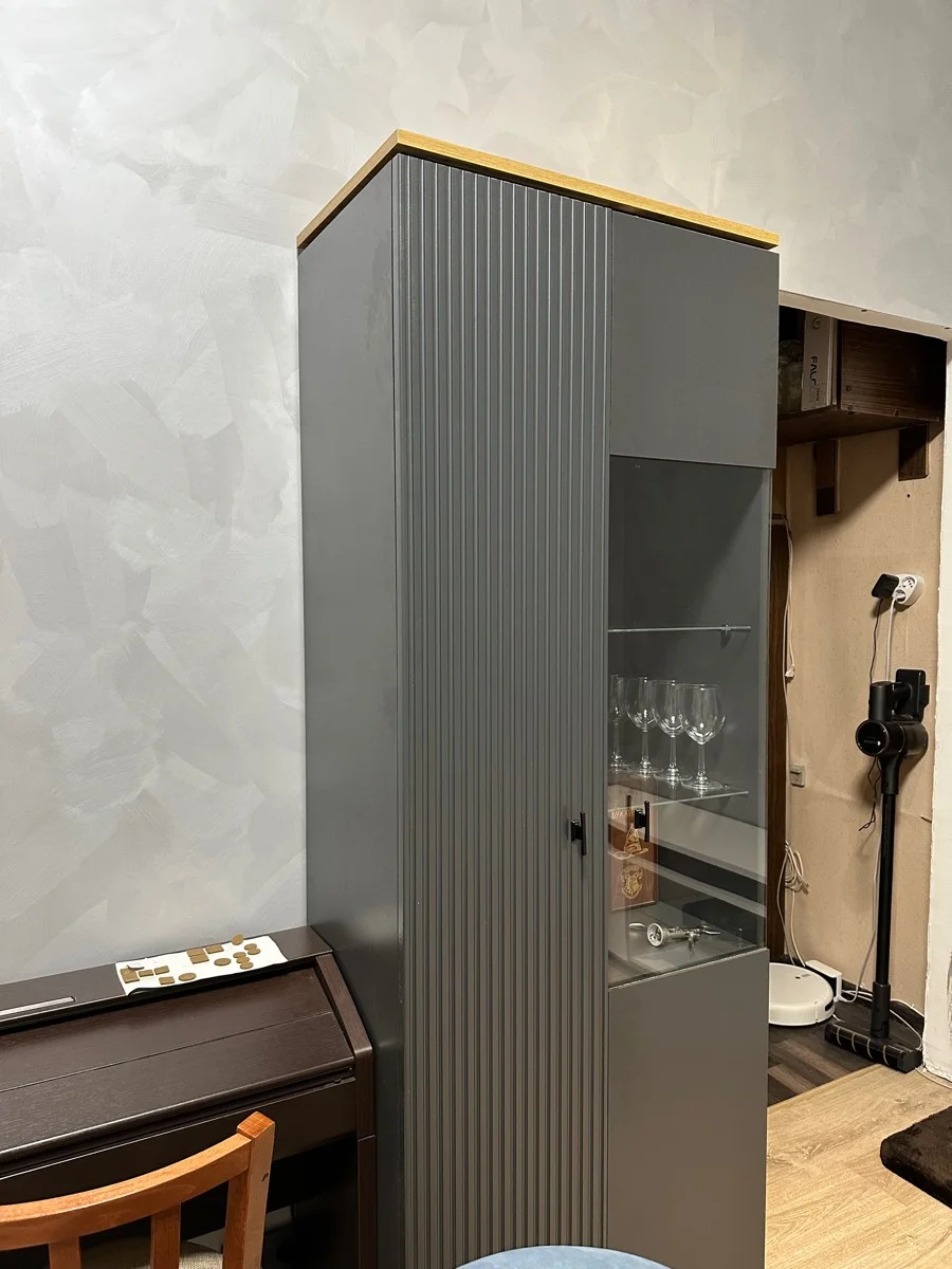 Шкаф имеет две распашные дверцы: одну с рельефной поверхностью, а вторую со стеклянной вставкой. Просторные полки с легкостью поместят в себя аксессуары, посуду, книги или одежду.