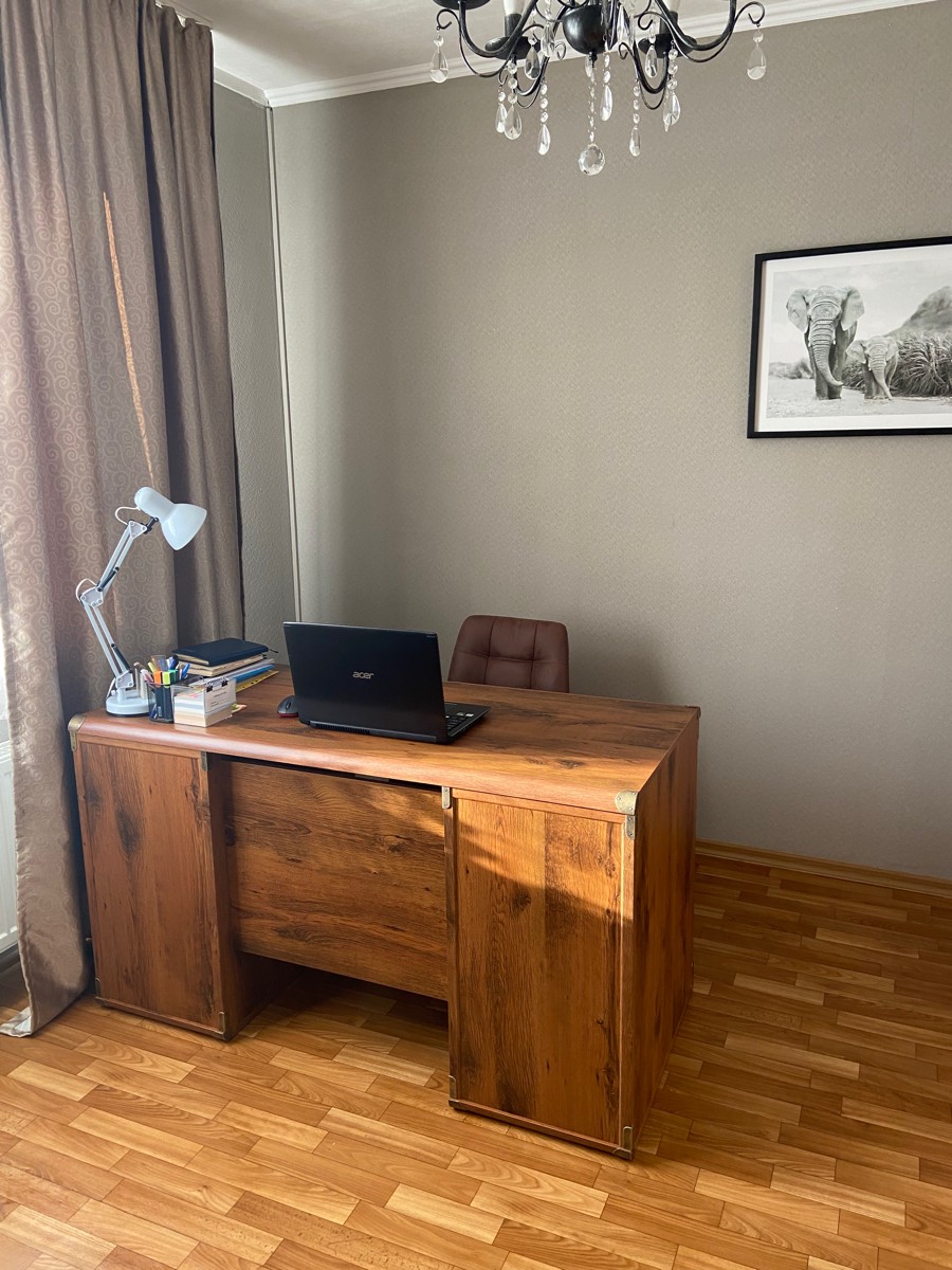 Стол имеет классическую и вместительную конструкцию. Верхняя столешница поможет разместить на себе мониторы, ноутбуки, настольные лампы, рабочие органайзеры. Выдвижная полка для клавиатуры обеспечит комфорт в использовании. Две тумбы по бокам имеют достаточно места для хранения рабочей канцелярии и принадлежностей.