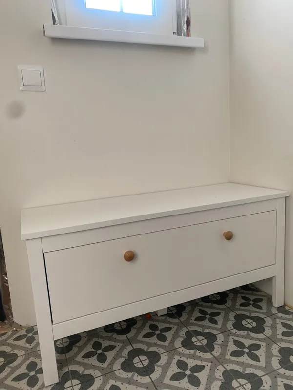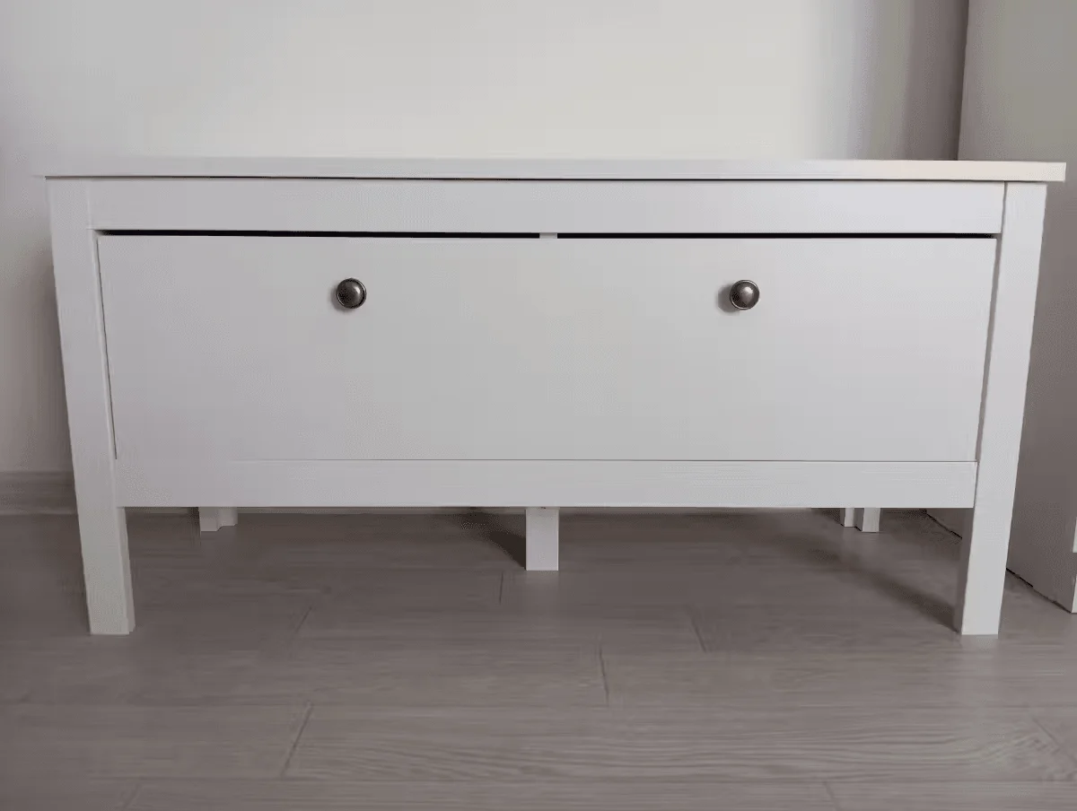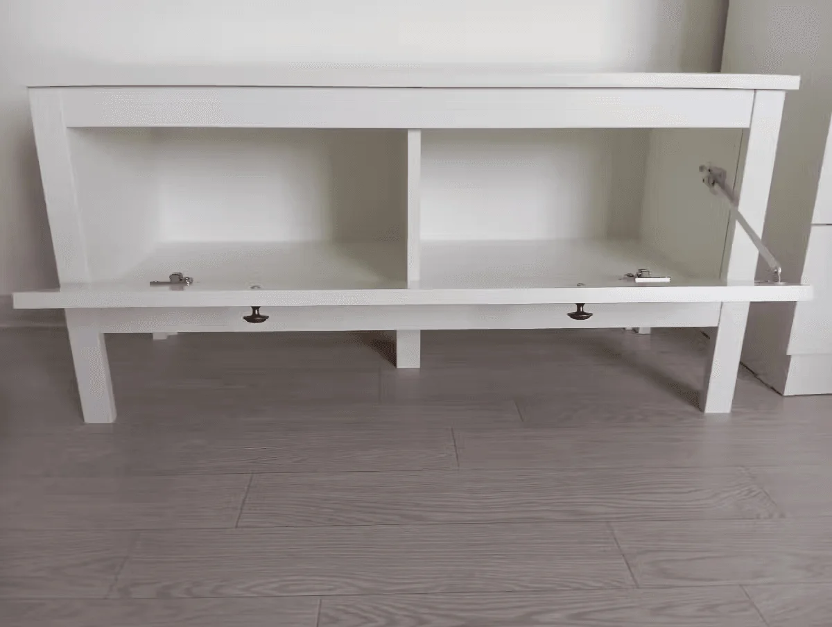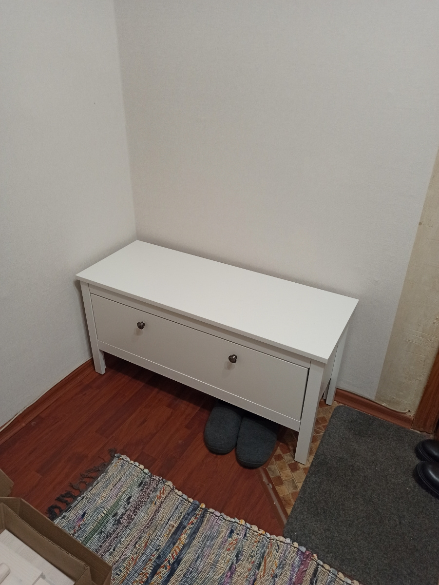 Обувница имеет простую, но надежную конструкцию. Откидная дверца предоставляет доступ к двум вместительным нишам. Вы можете хранить обувь как внутри, так и под тумбой, благодаря высоким ножкам.