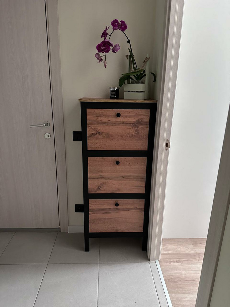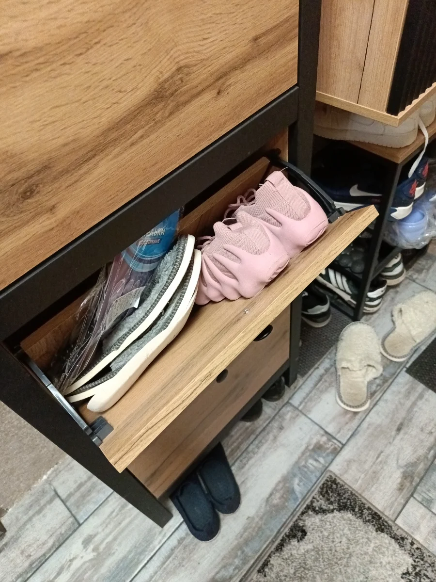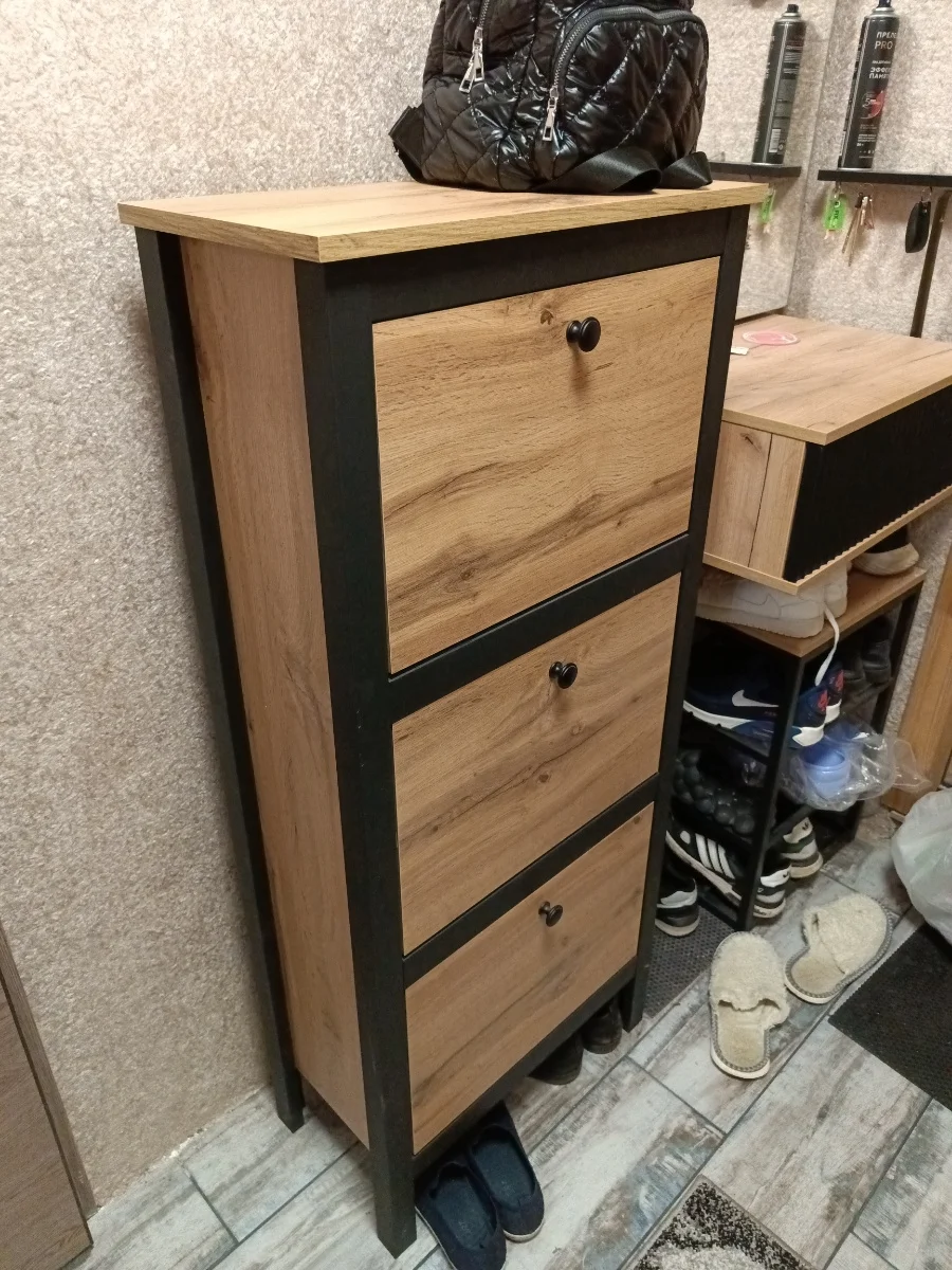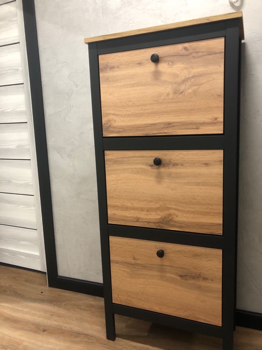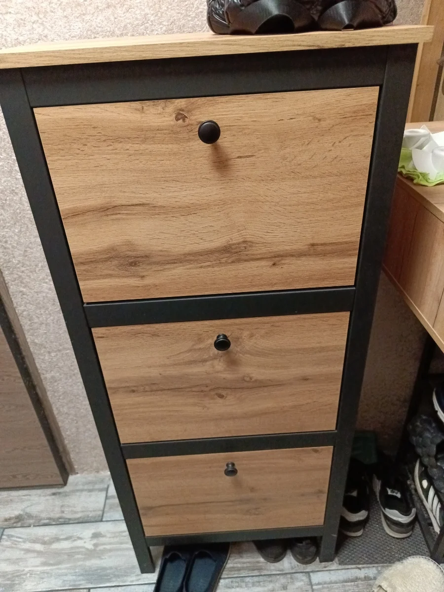 Тумба состоит из трех откидных дверок с металлическими ручками, за которыми скрыты кассеты для хранения обуви. Верхнюю крышку можно задействовать для хранения зонтиков, ключей и других аксессуаров. Высокие ножки из МДФ придают устойчивости конструкции и упрощают уборку под обувницей.
