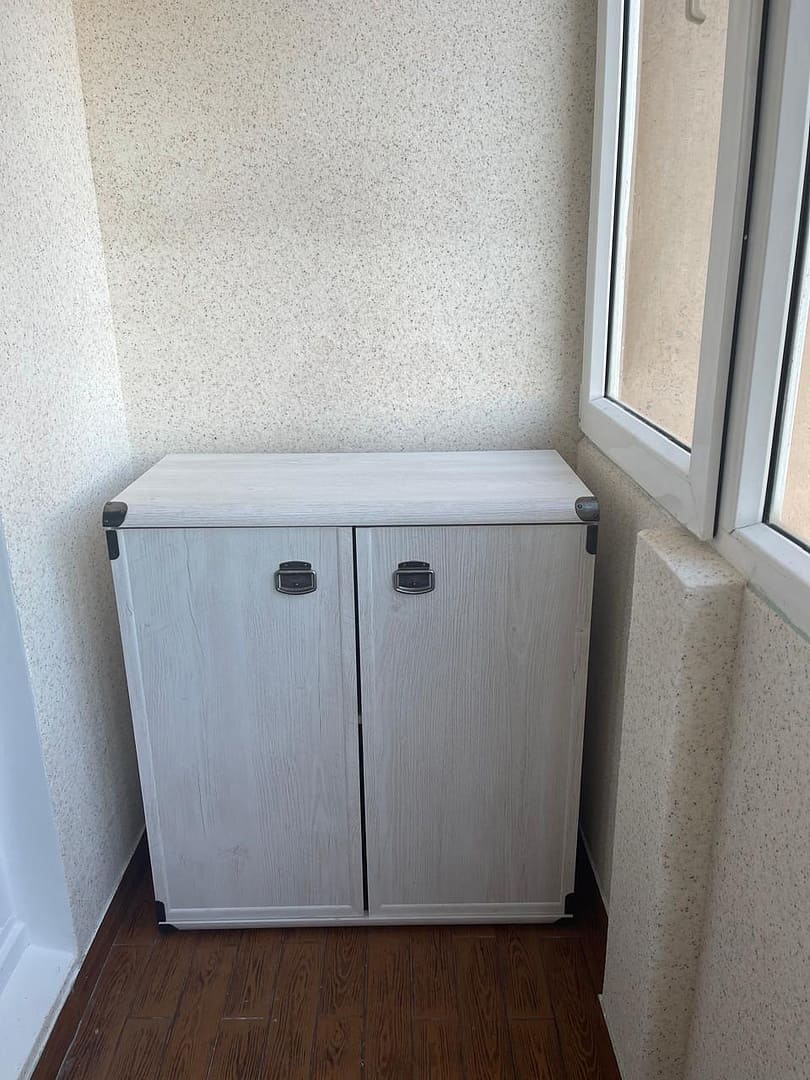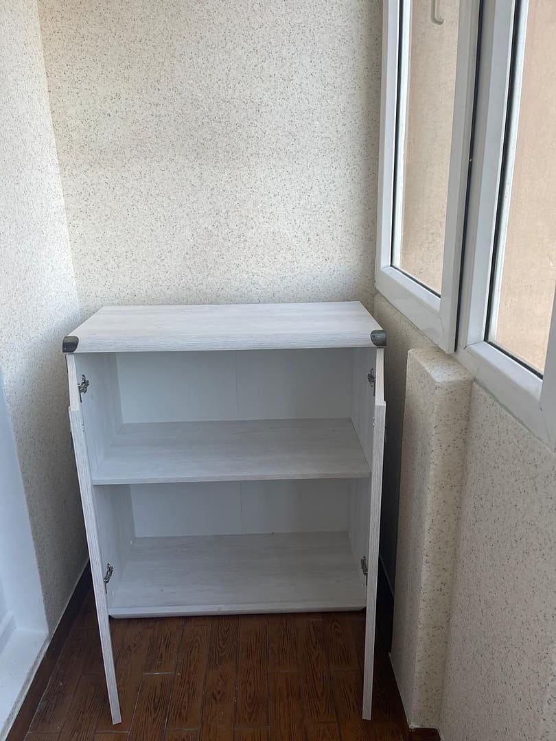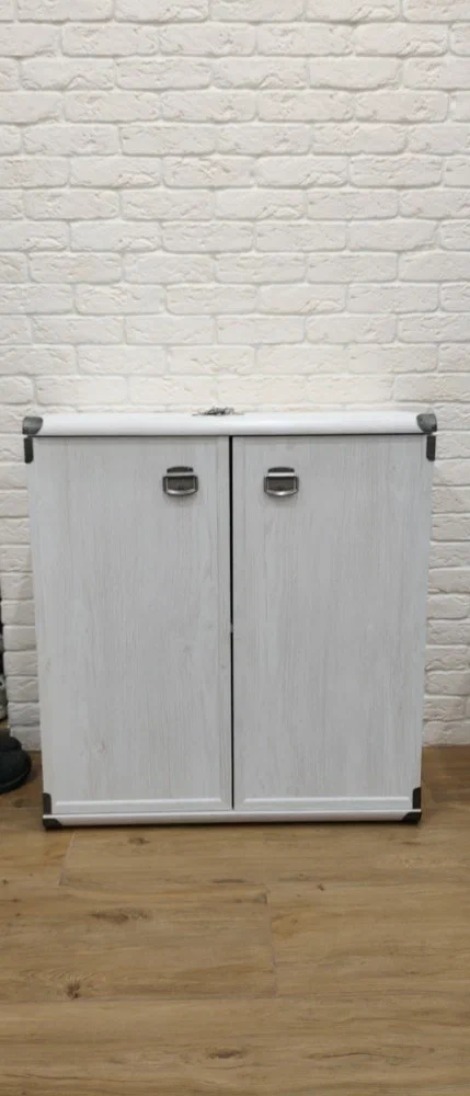 Тумбочка обладает распашными дверцами с металлическими ручками, за которыми скрыты вместительные ниши для хранения. Полку можно регулировать по высоте или полностью убрать для размещения высоких предметов.