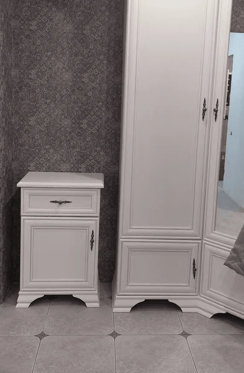 Компактные размеры тумбы позволяют легко разместить ее в небольших помещениях. Декоративные накладки на ручках добавляют изысканности и подчеркивают классический стиль. Фигурные ножки из МДФ обеспечивают устойчивое расположение на полу.