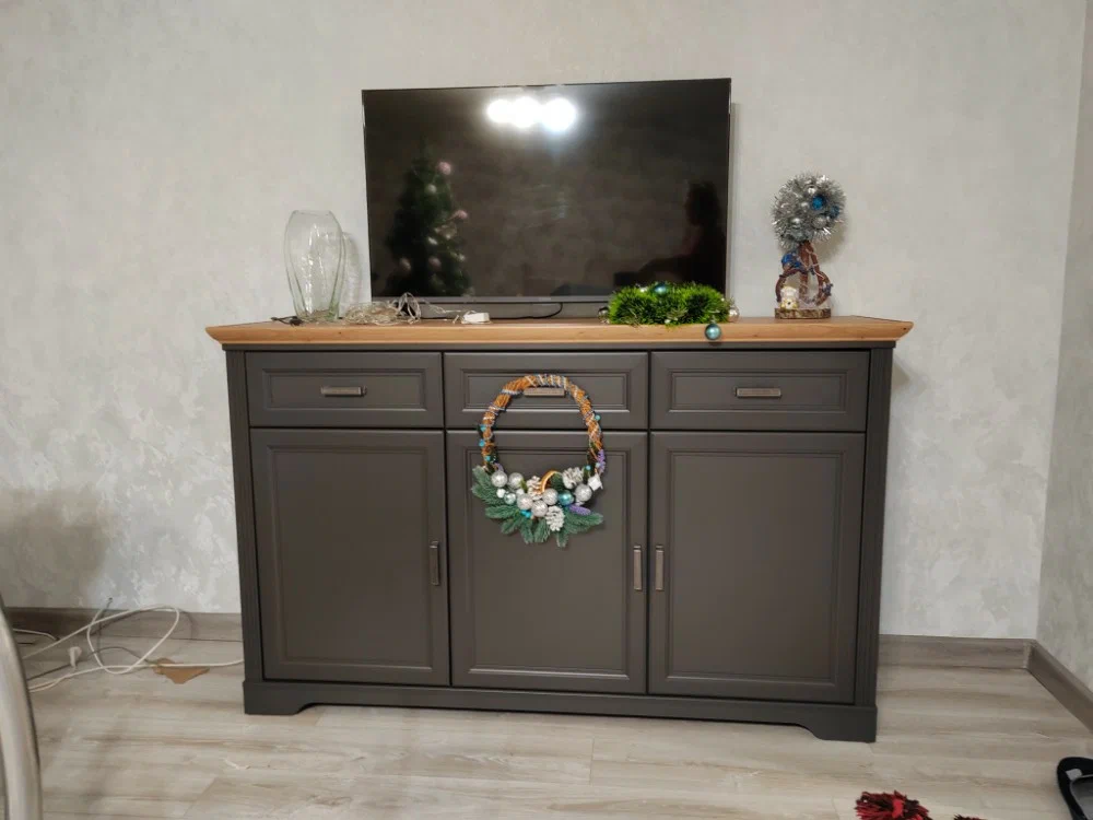 Комод имеет три полки, скрытые за распашными дверками, и три ящика. Центральную дверь можно установить, как с левой, так и с правой стороны. Полки и ящики выдерживают вес до 4 кг.