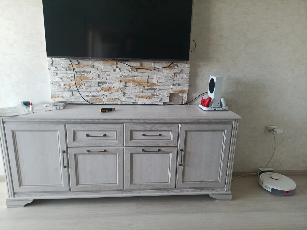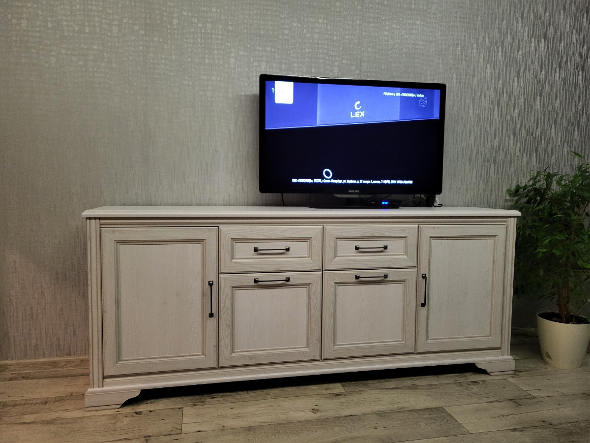 Его высота (80 см) позволяет сверху разместить экран любой диагонали, и обзор будет хорошим отовсюду. Крышка, как и весь корпус, изготовлена из ЛДСП, то есть это большая, прочная и гладкая поверхность с красивым «деревянным» рисунком, которая выдержит значительные нагрузки.
