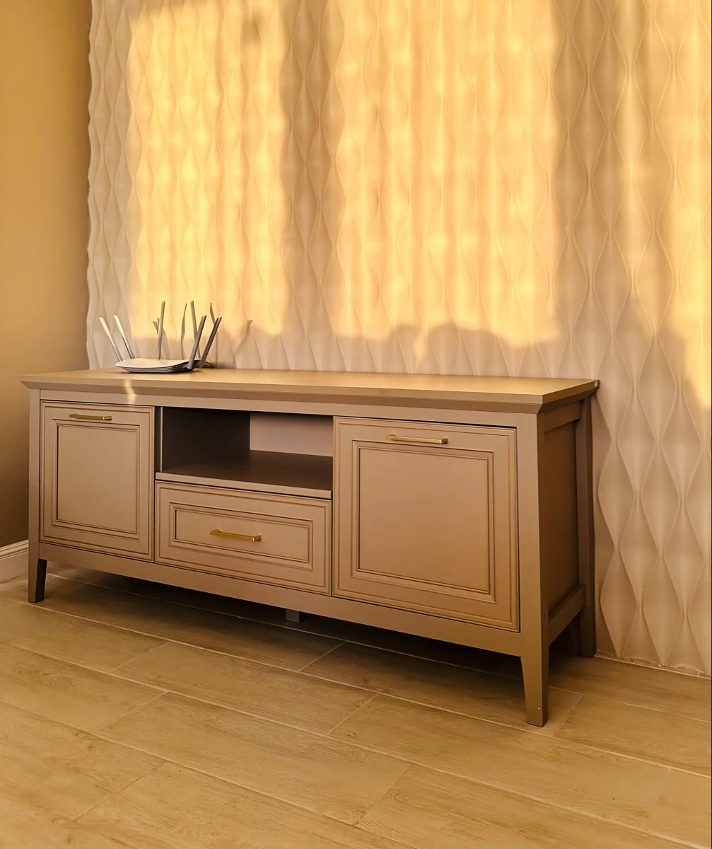 В центральной части расположены два отделения: открытая полка и выдвижной ящик, предоставляющий дополнительное пространство. Слева и справа от центральной части тумбы находятся секции с откидными дверцами, которые обеспечивают удобный доступ и добавляют стильный акцент к дизайну. Ящик открывается бесшумно и плавно за счёт шариковых направляющих.