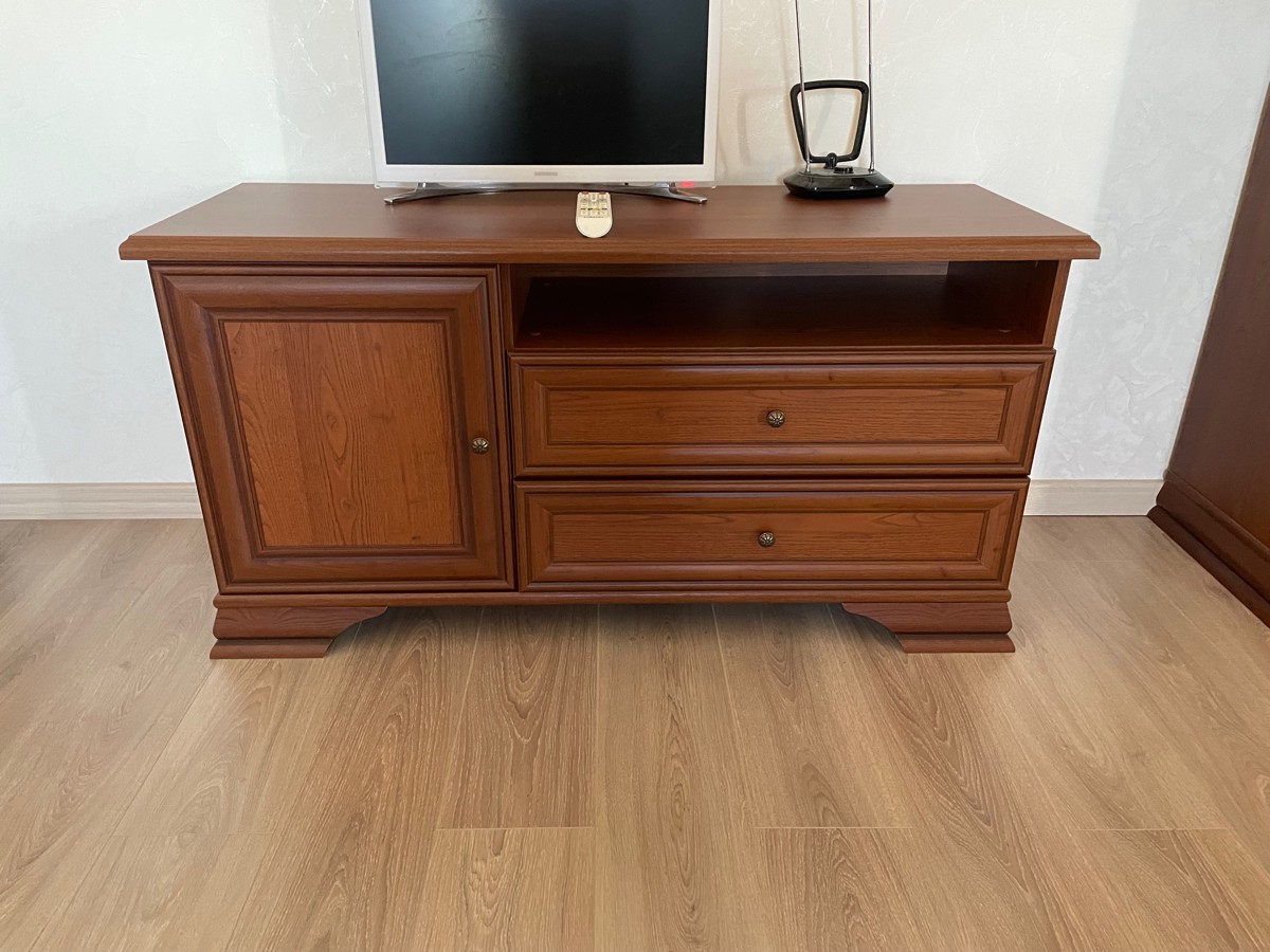 Просторная столешница разместит на себе телевизор с диагональю до 54`. В открытой полке удобно расположить телевизионные приемники, DVD-плееры, игровые консоли. В закрытых ящиках и полках вы можете хранить диски, бумаги, документы и элементы декора.