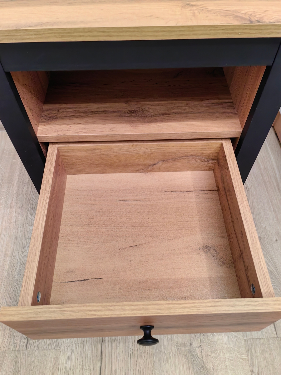 Тумба прикроватная Loft дуб вотан KOM1S гармонично смотрится в комплекте с полутороспальной кроватью из одноименной коллекции.