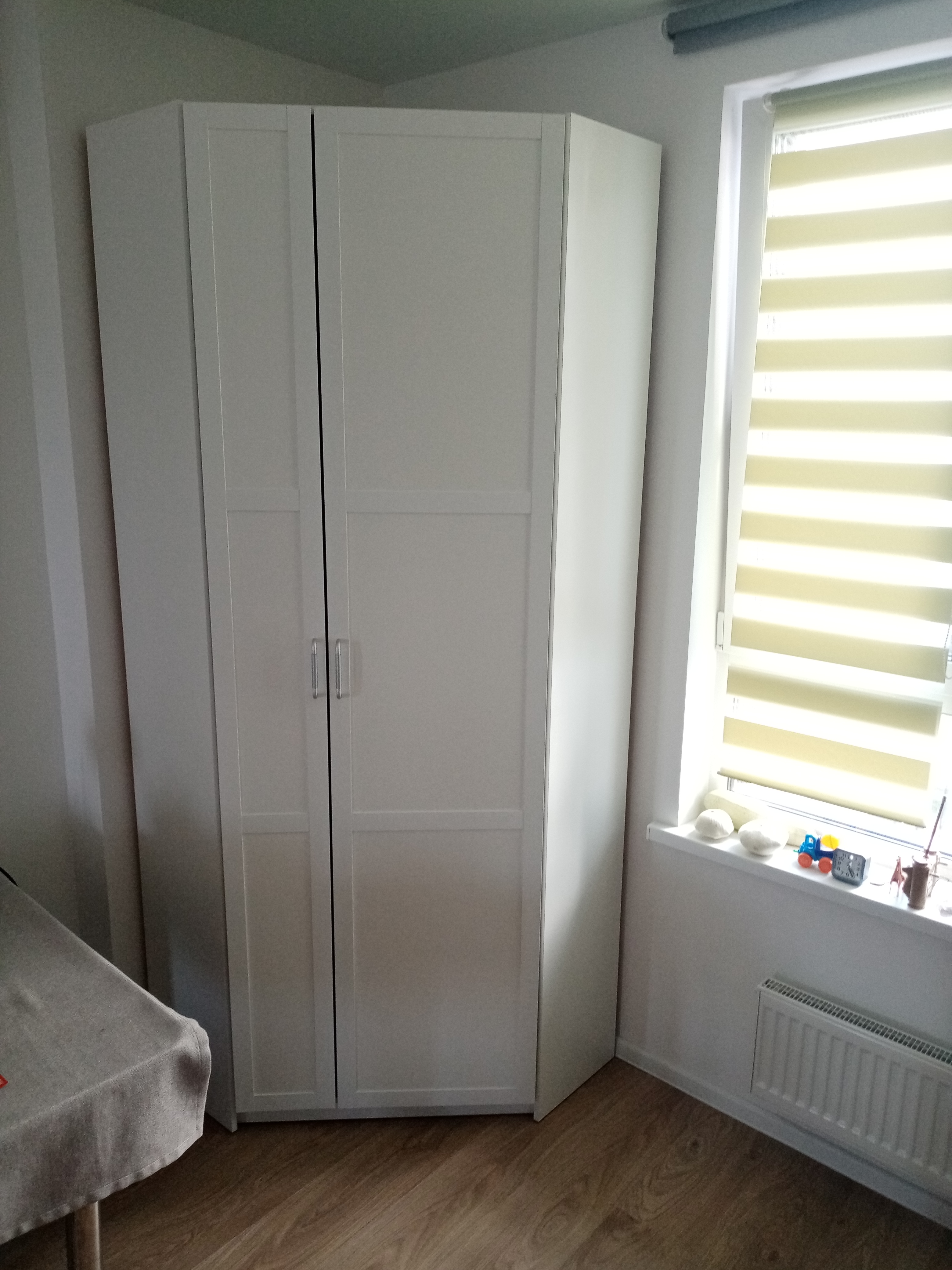 Компактный размер позволяет разместить шкаф даже в небольшой комнате. Угловая конструкция скрывает недостатки планировки и позволяет рационально использовать пространство.