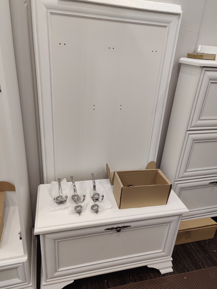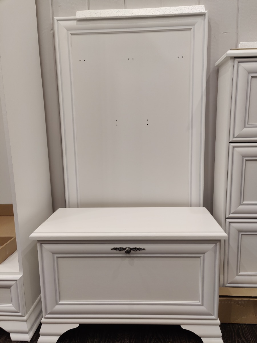 Корпус и фасад вешалки выполнены в белом цвете, что визуально расширяет пространство и создает ощущение чистоты и свежести. Поверхность комбинированная, что придает изделию дополнительную изысканность и текстурное разнообразие. Особенностью конструкции является филенка и карниз, которые подчеркивают классический стиль и добавляют изделию элегантности.