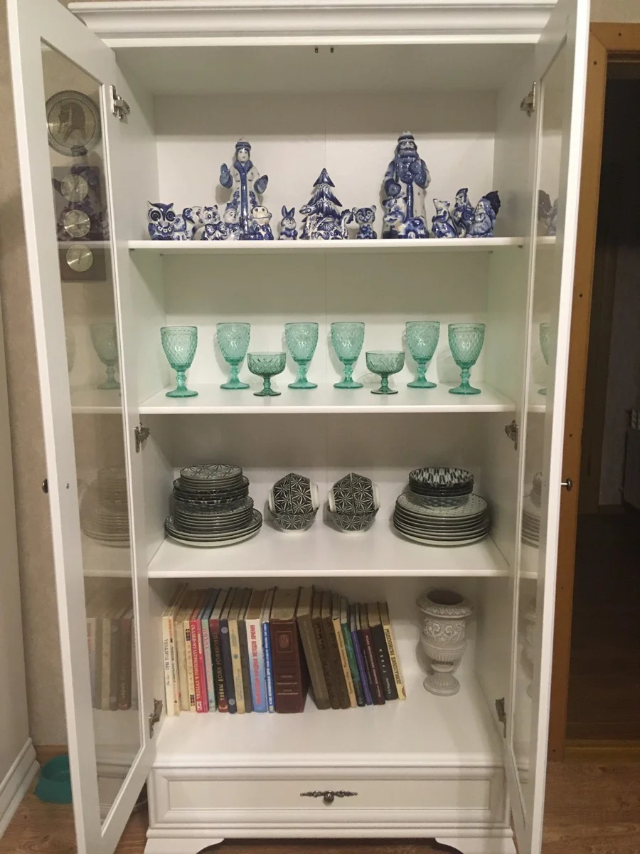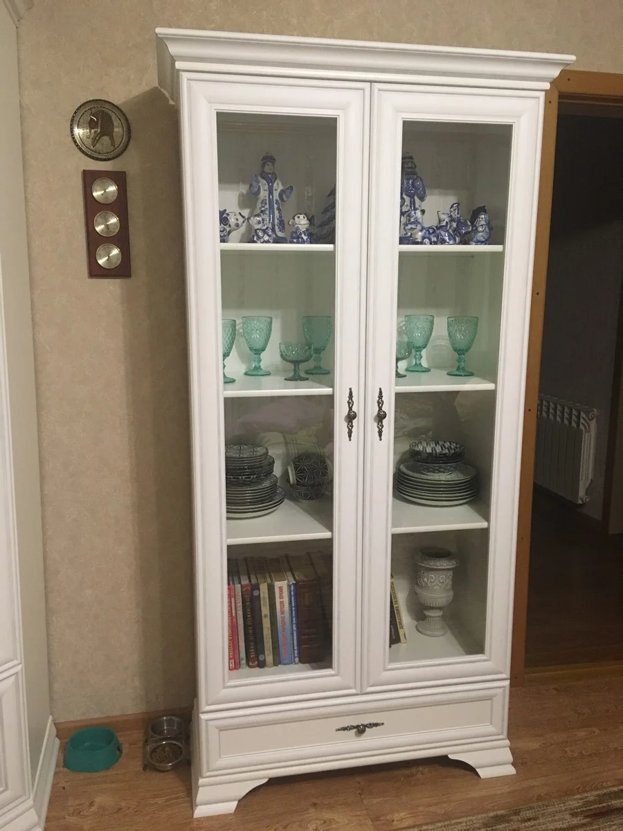 Благодаря продуманной конструкции она идеально подходит для хранения и демонстрации любимых предметов. Витрина имеет четыре просторные полки, защищенные стеклянными дверцами. Вы можете разместить внутри посуду, хрусталь, книги или коллекционные предметы. В нижней части расположен выдвижной ящик, удобный для хранения столовых приборов, салфеток, текстиля или канцелярии.