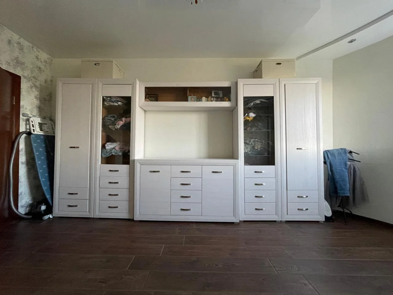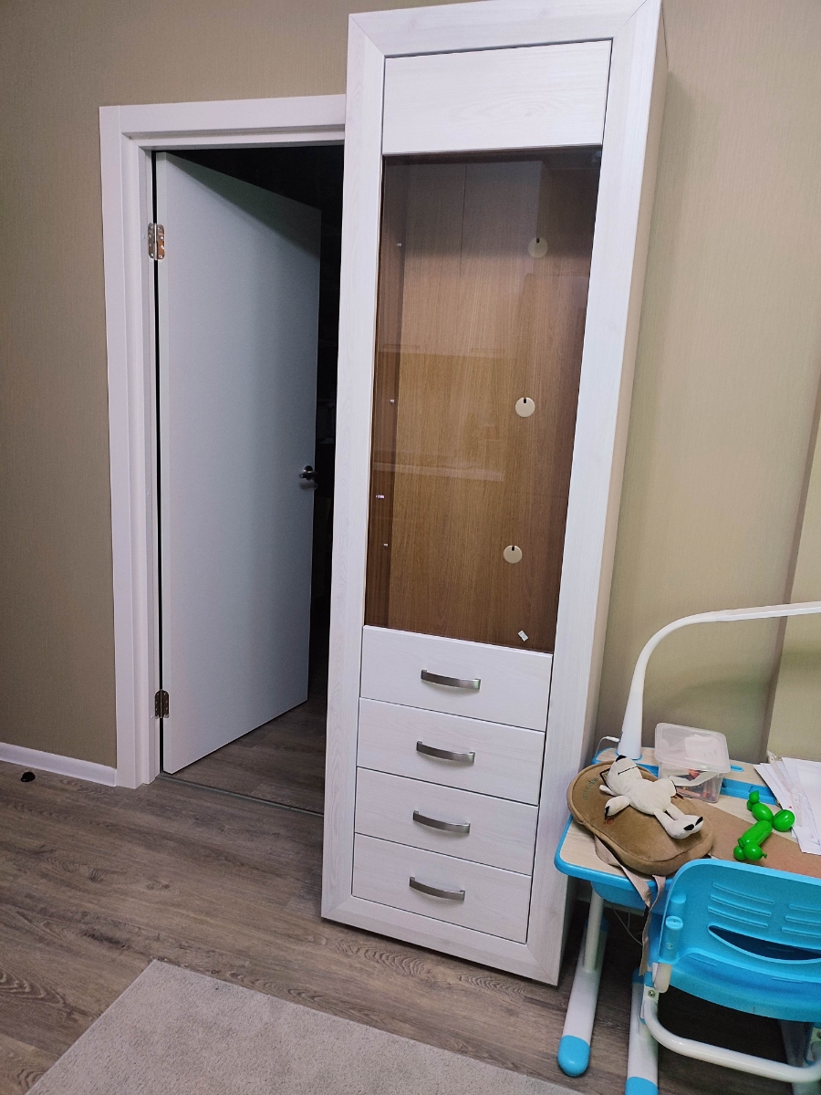 Витрина изготовлена из ЛДСП. Достаточно протирать поверхность слегка влажной или сухой салфеткой при видимых загрязнениях.